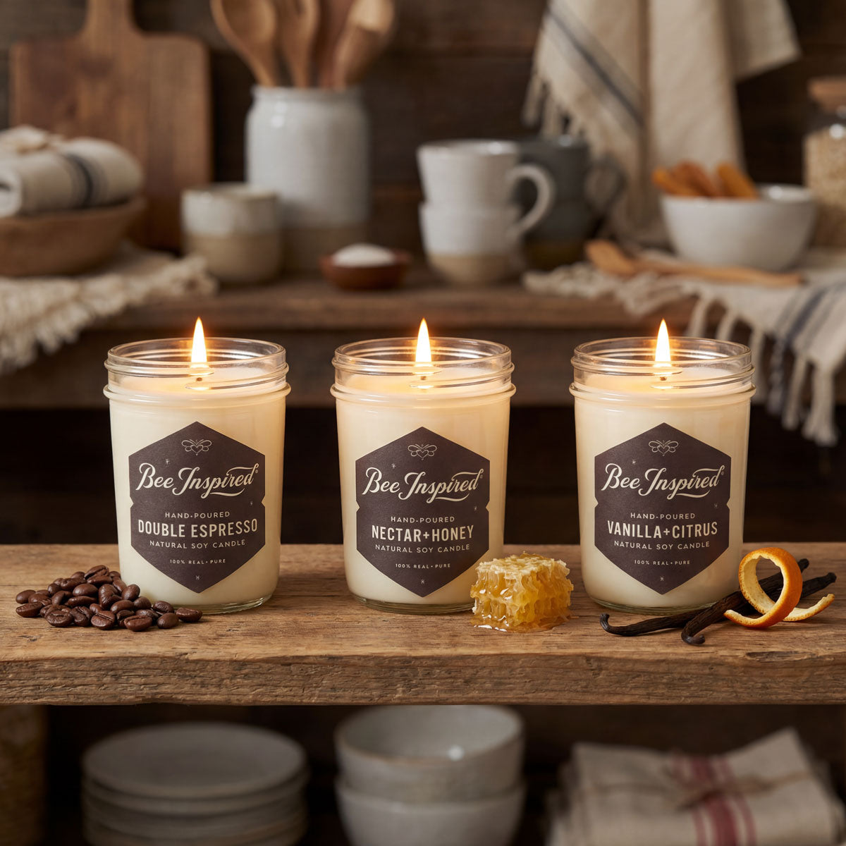These three candles were made in Owings Mills after people kept asking for the food scents. Not generic "vanilla" that smells like a car air freshener. Actual espresso. Actual honey with a floral edge. Actual tangerine mixed with cream.