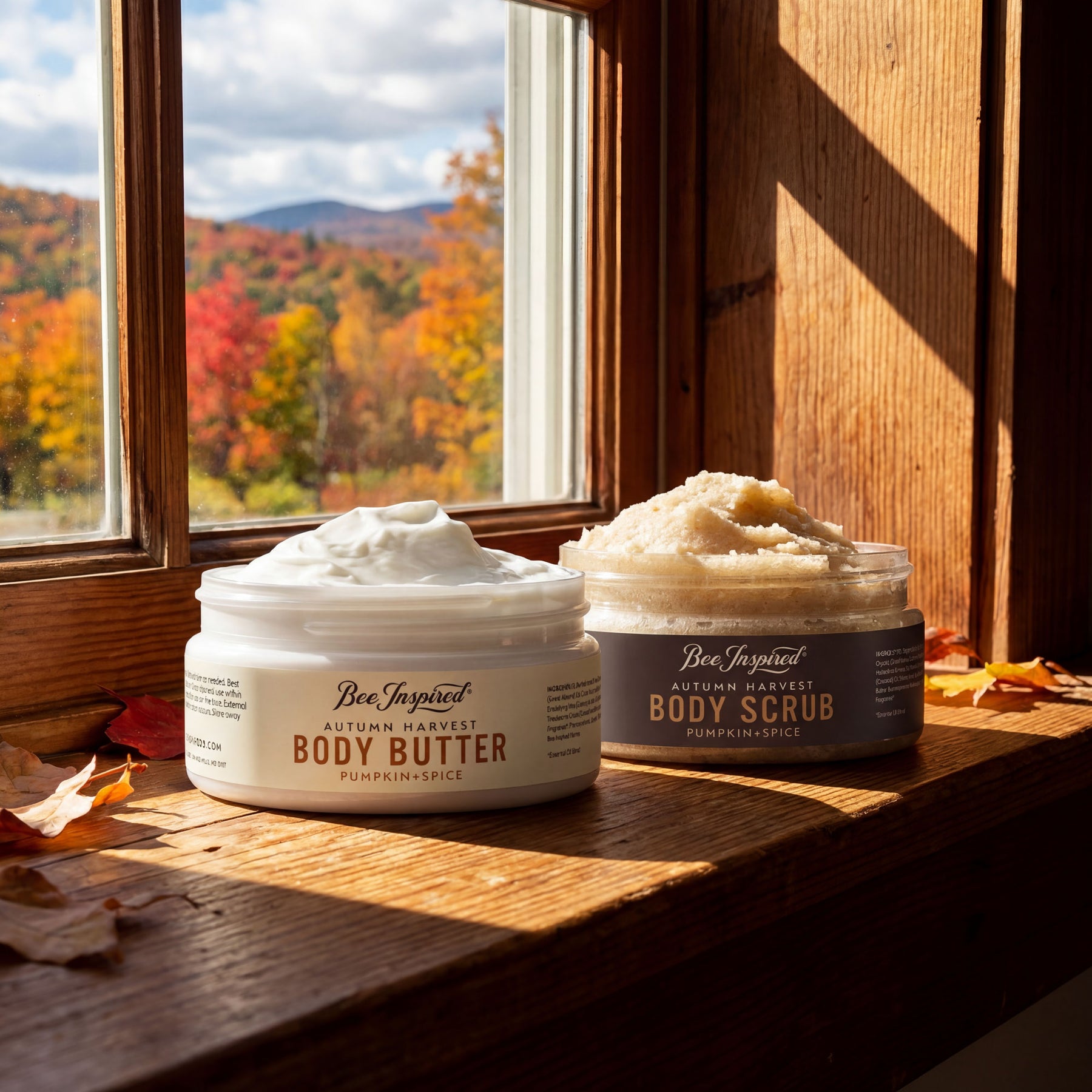 - Autumn Harvest Body Butter (7oz): Sweet almond oil, coconut oil, organic cocoa butter, beeswax, and honey. Same Pumpkin and Clove Essential Oil.