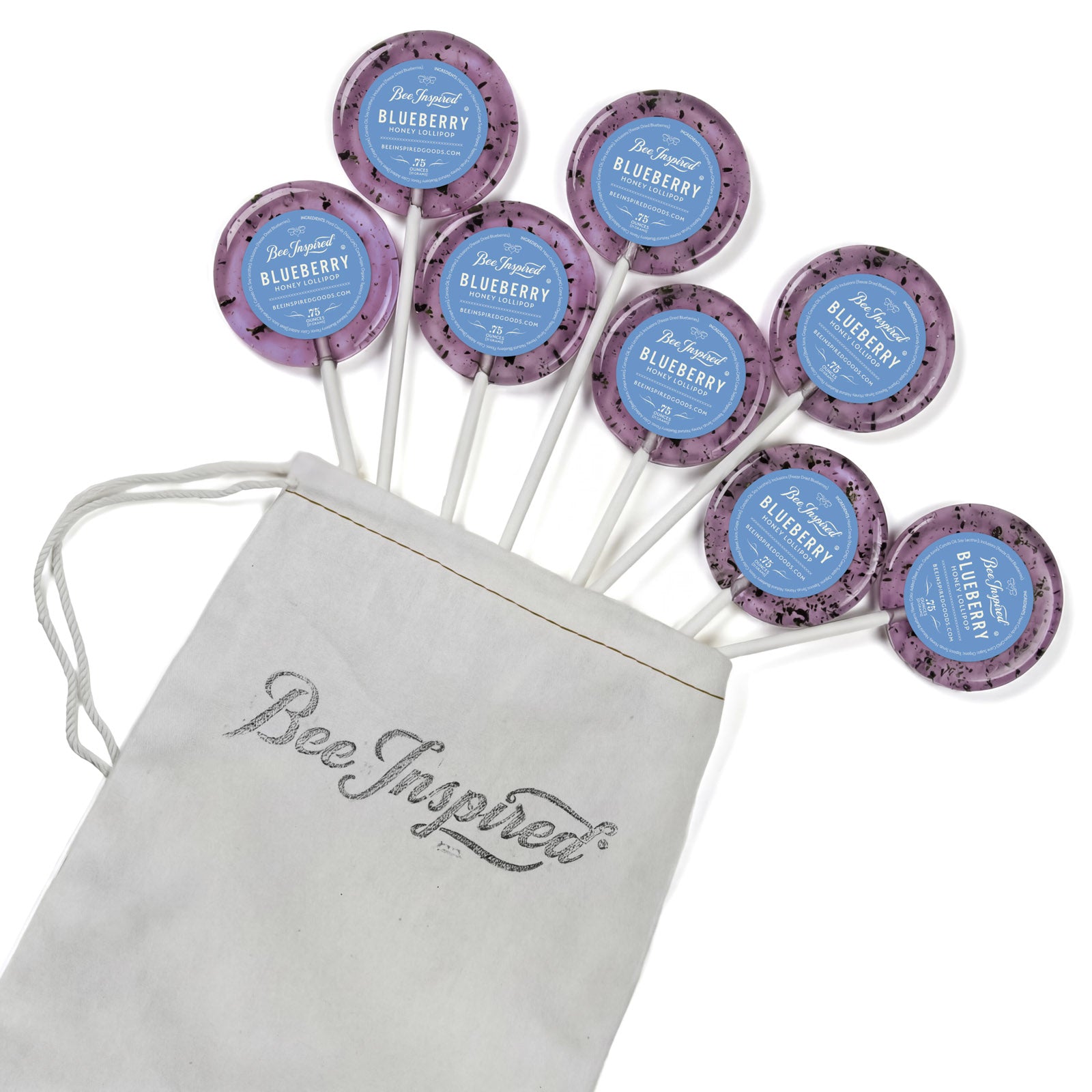 Each blueberry lollipop is handcrafted in our Maryland apiary with simple, quality ingredients. We use non-GMO cane sugar, honey from our own bees, and real freeze-dried blueberries for authentic fruit flavor. The addition of soy lecithin helps create a smooth texture, while canola oil serves as a natural releasing agent during the candy-making process.