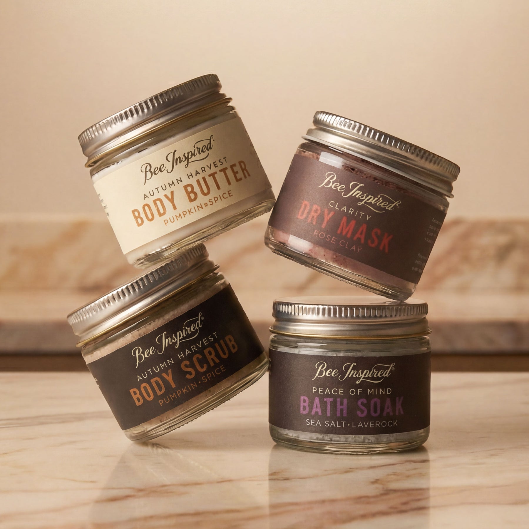 This is the petite version of our Autumn Prosperity collection. Four products in travel sizes that aren't decorative. People use them. The scrub gets thrown in gym bags for post-workout showers. The body butter lives on nightstands. The clay mask sits on bathroom counters next to whatever face wash runs out first.