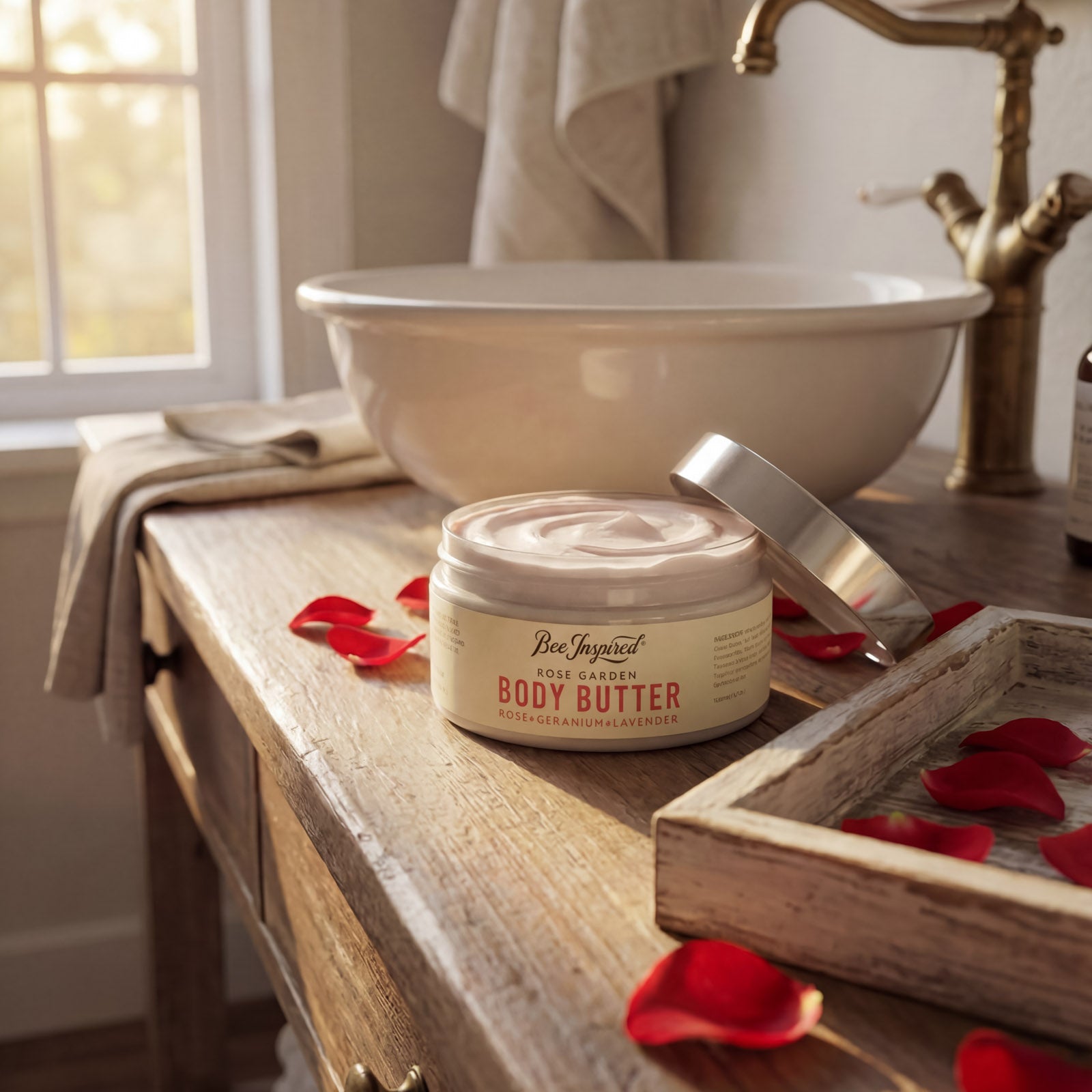 Our exclusive formula blends organic cocoa butter with sweet almond oil and Bee Inspired Honey in a silky, fast-absorbing texture that moisturizes and hydrates beautifully. The result? Velvety-smooth skin enveloped in the delicate fragrance of a summer rose garden—a sensory retreat that both comforts the skin and delights the senses.